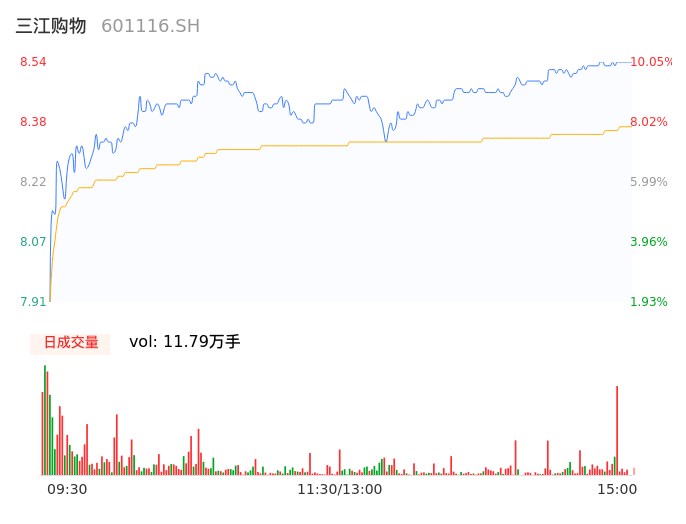 04月17日,三江购物收报8.54,股价涨幅10.05%,成交金额9862.18万元,换手率2.15%。