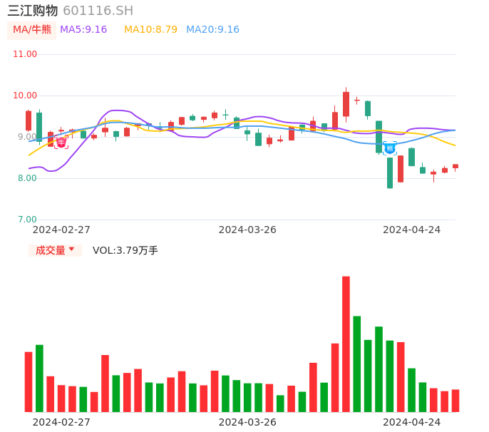 04月24日,三江购物收报8.33,股价涨幅1.09%,成交金额3130.01万元,换手率0.69%。