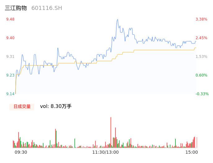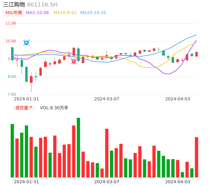 04月03日,三江购物收报9.38,股价涨幅2.29%,成交金额7760.30万元,换手率1.52%。