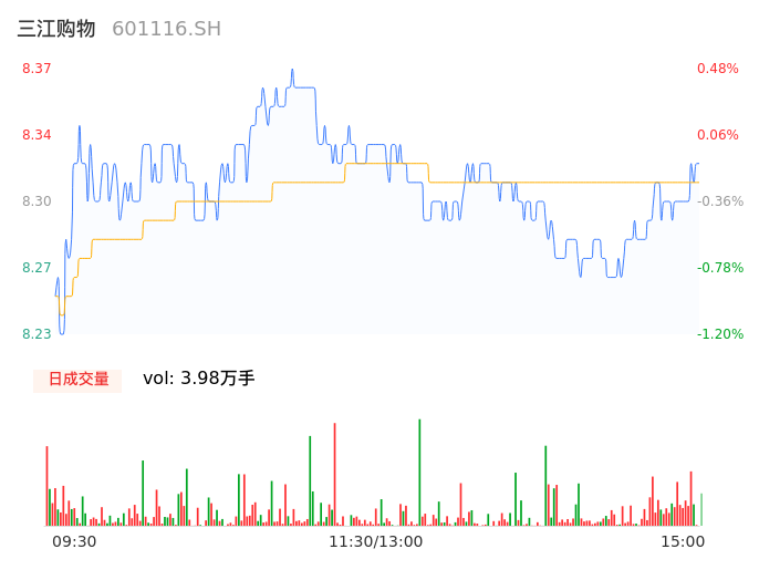 04月25日,三江购物收报8.31,股价涨幅-0.24%,成交金额3306.81万元,换手率0.73%。