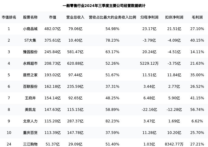三江购物最新报告期数据为三季度,下表汇总了一般零售行业内市值靠前的公司三季度主要经营数据