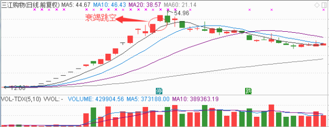 定义:这类跳空出现在接近市场运动的尾声。在上升趋势的最后阶段,价格沿着原来的方向进行最后的冲刺,虚晃一枪。因此在上涨趋势末端,很多散户受惑于这种跳空,而纷纷高位套牢。