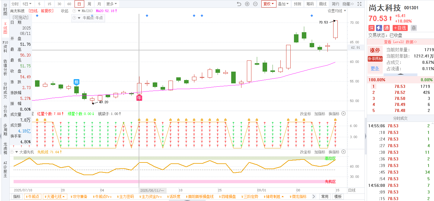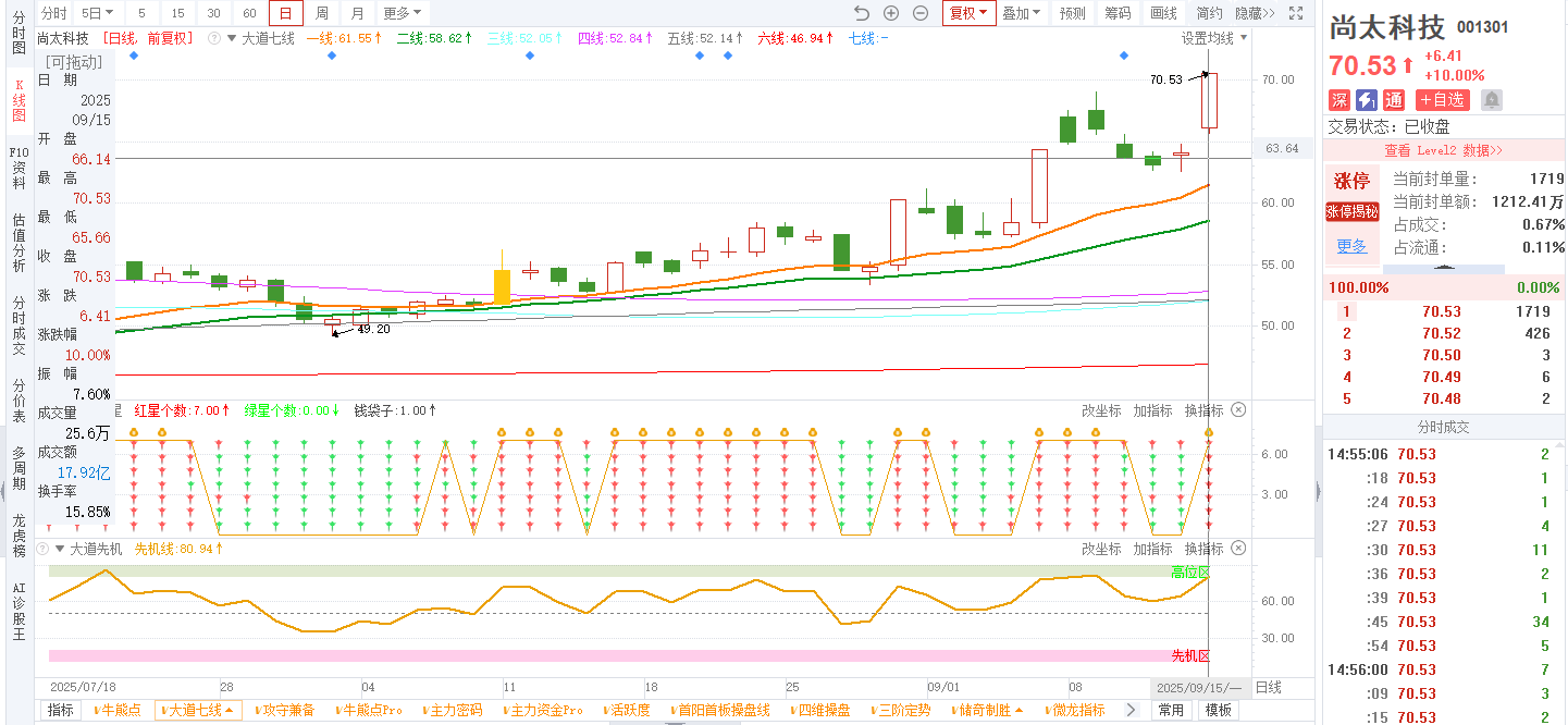 3)参考技术指标:20250915-尚太科技-001301-大道七线-日线回踩1号线2号线不破,且大道七星全红;20250811-尚太科技-001301-牛熊点指标-日线出现牛点信号;