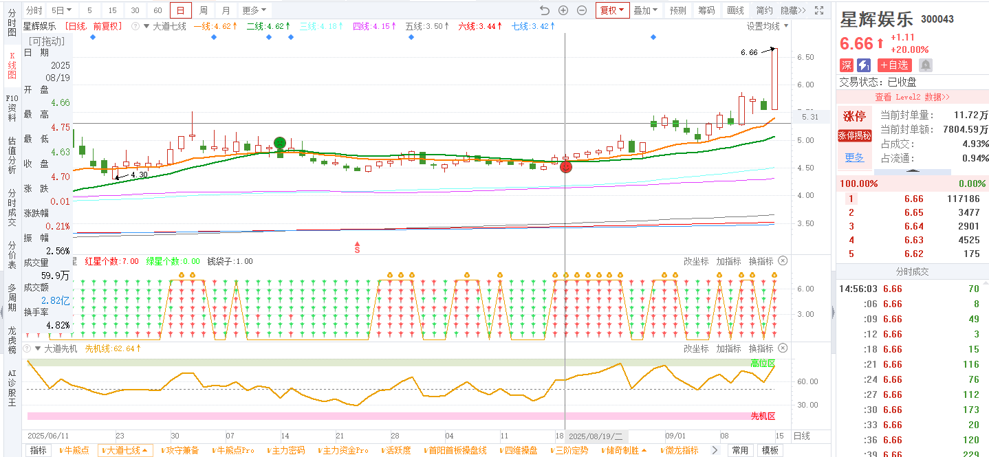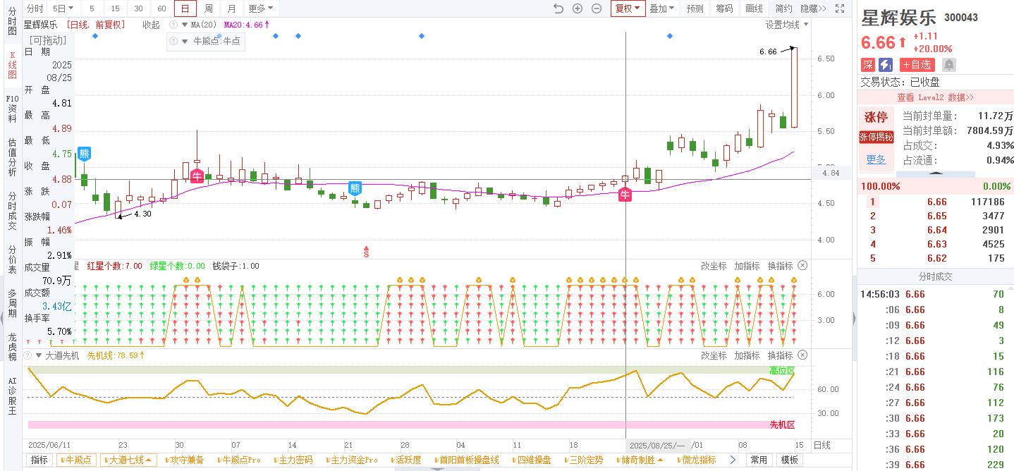 3)参考技术指标:20250819-星辉娱乐-300043-大道七线-日线出现笑脸信号,且大道七星全红;20250825-星辉娱乐-300043-牛熊点指标-日线出现牛点信号;