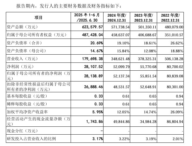 财务方面,于2022年度、2023年度、2024年度和2025年1-6月,公司实现营业收入50.61亿元(人民币,下同)、37.83亿元、34.86亿元和17.97亿元;同期,取得净利润8.07亿元、5.58亿元、5.20亿元和2.81亿元。根据招股书,2023年、2024年,受产业链景气度回落,下游涂料、建材、纺织等应用领域市场需求减弱以及原材料、能源价格下降等因素影响,公司存在营业收入下滑情况。2025年1-6月营业收入同比提升1.81%,经营业绩止跌回稳。