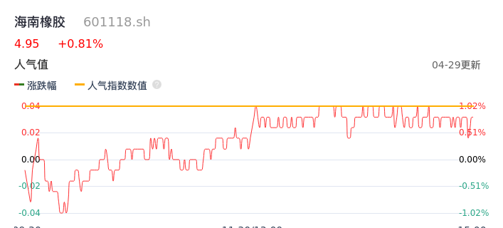 04月29日,海南橡胶收报4.95,股价涨幅0.81%,成交金额1.89亿元,换手率0.90%。