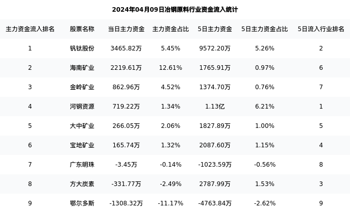 从主力资金流向来看,冶钢原料行业今日主力资金流入5.27亿元,在所有申万二级行业中排名:31/131。