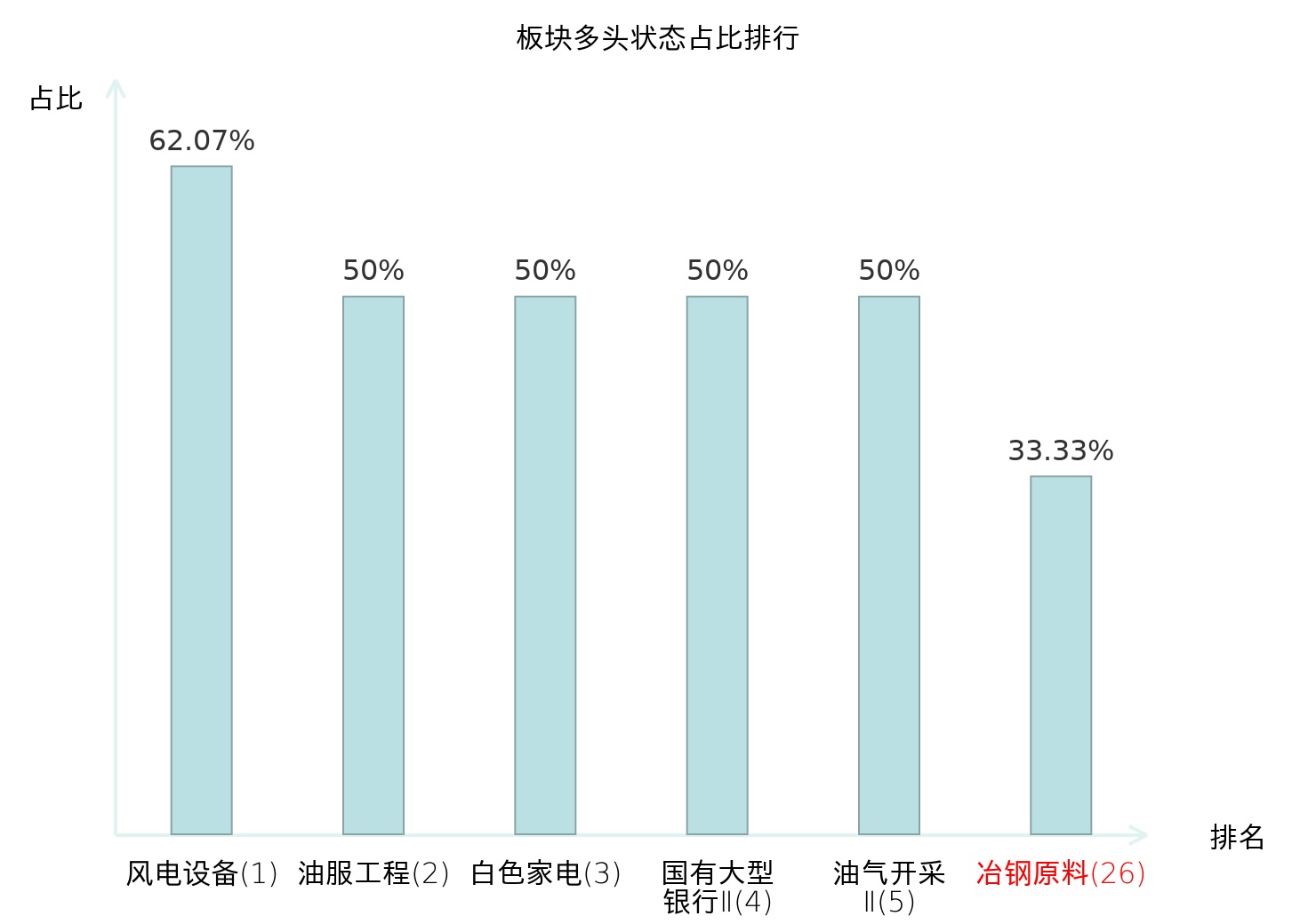 全市场所有行业板块中主力多头状态占比排名中,风电设备板块位居第一。动物保健Ⅱ板块名次提升最快,较昨日上升64位。