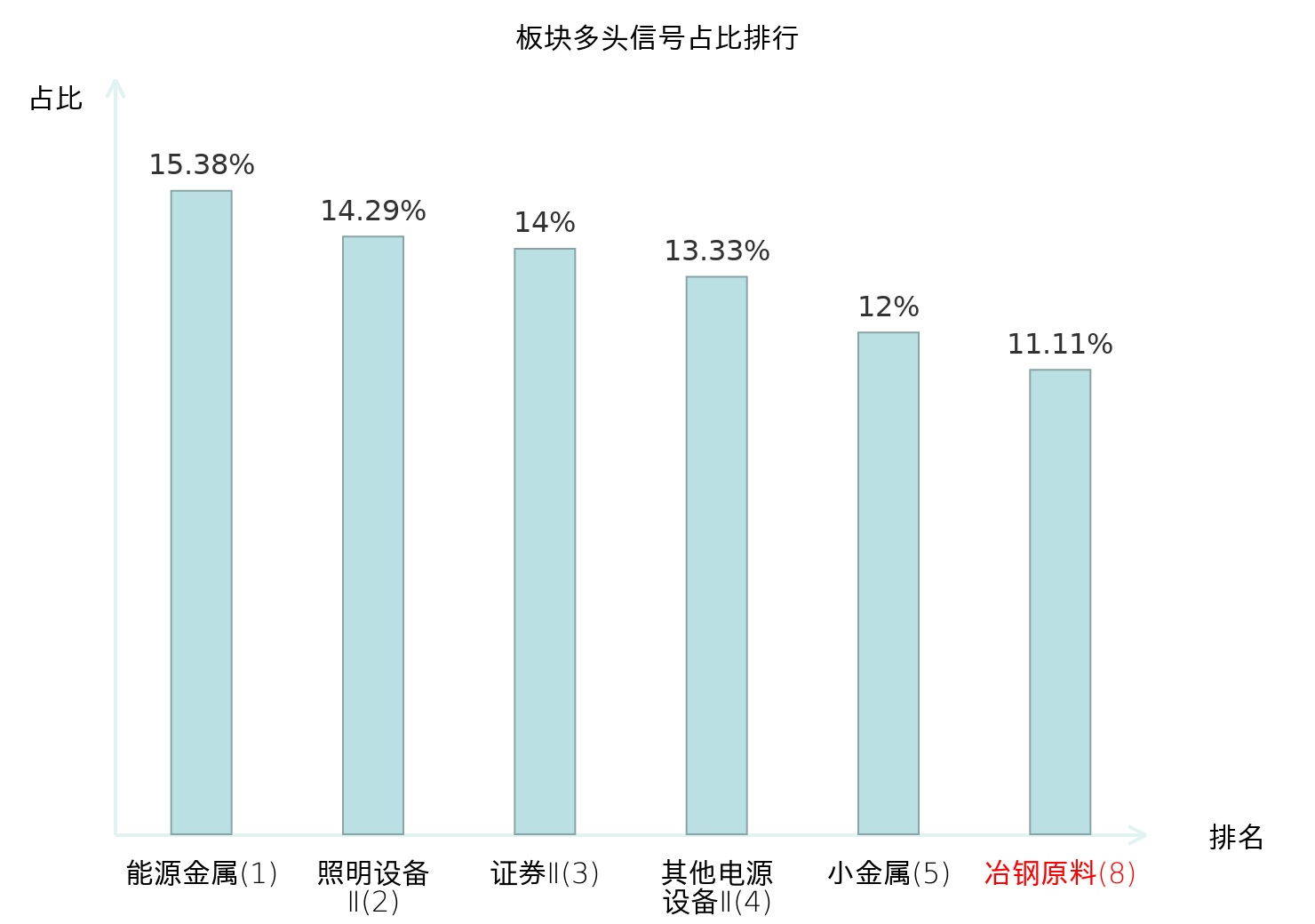 全市场所有行业板块中主力多头信号占比排名中,能源金属板块位居第一。贵金属板块名次提升最快,较昨日上升101位。
