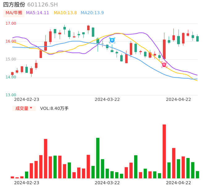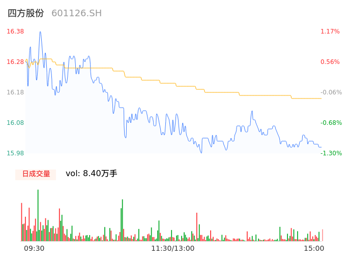 04月22日,四方股份收报16.00,股价涨幅-1.17%,成交金额1.36亿元,换手率1.03%。