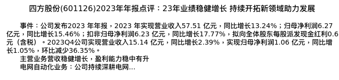 值得注意的是:2024年03月光大证券的殷中枢/郝骞/和霖分析师,首次发布关于四方股份的研究报告,标题为:四方股份(601126)2023年年报点评:23年业绩稳健增长 持续开拓新领域助力发展。