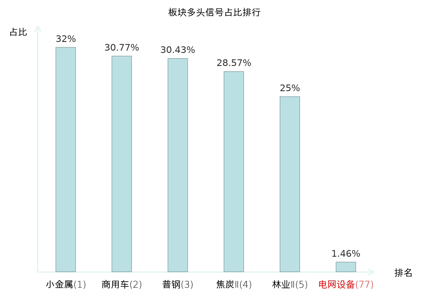 全市场所有行业板块中主力多头信号占比排名中,小金属板块位居第一。林业Ⅱ板块名次提升最快,较昨日上升121位。