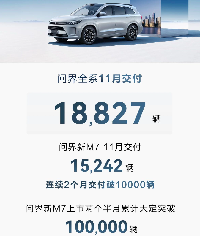 根据“AITO汽车”公众号公布的数据,11月,AITO问界系列共交付新车18827辆。问界新M7交付新车15242辆,累计交付超2.7万辆。