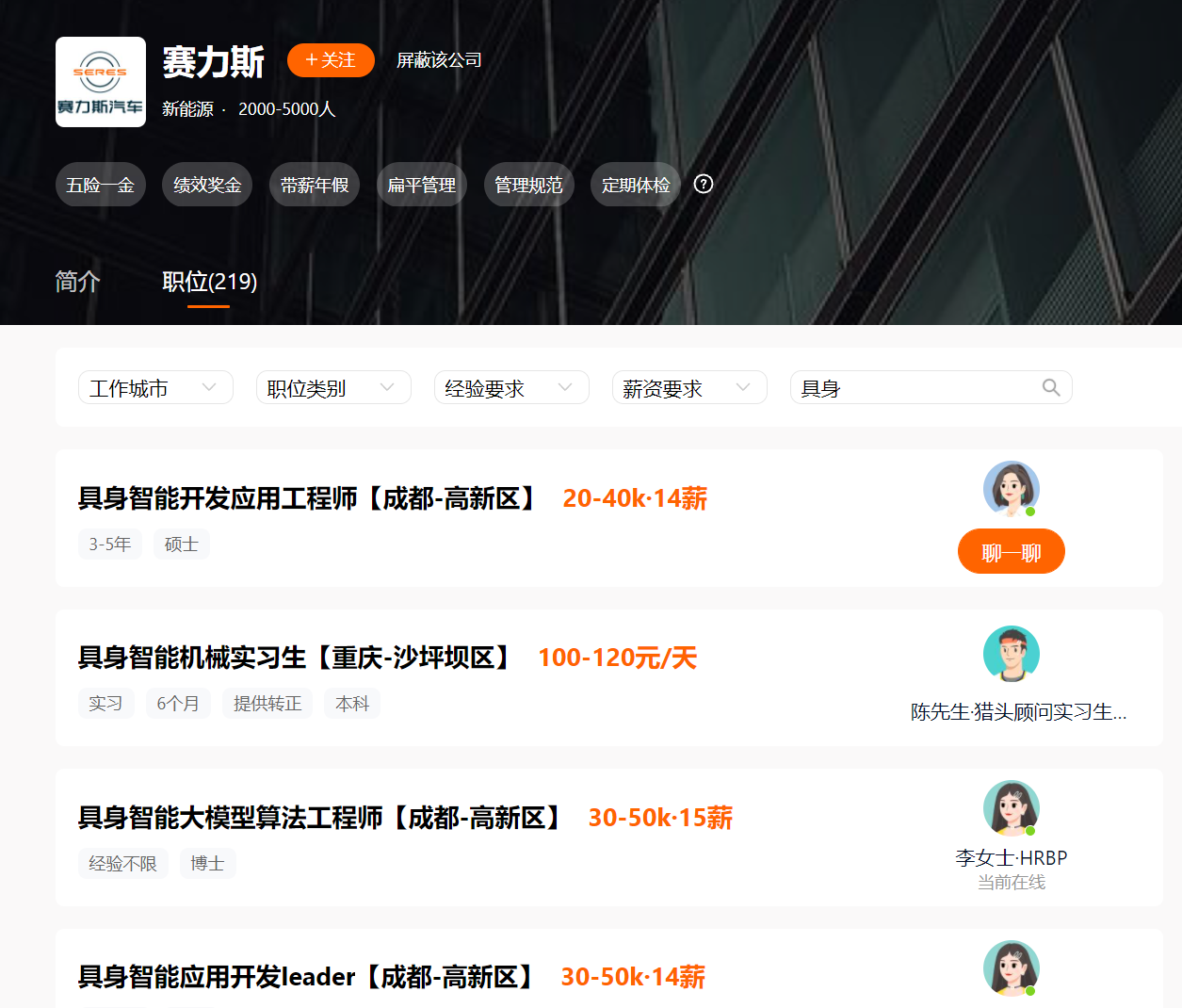 2.赛力斯近期发布了大量机器人相关岗位招聘,包括机器人集成助理工程师、具身智能嵌入式开发岗位。