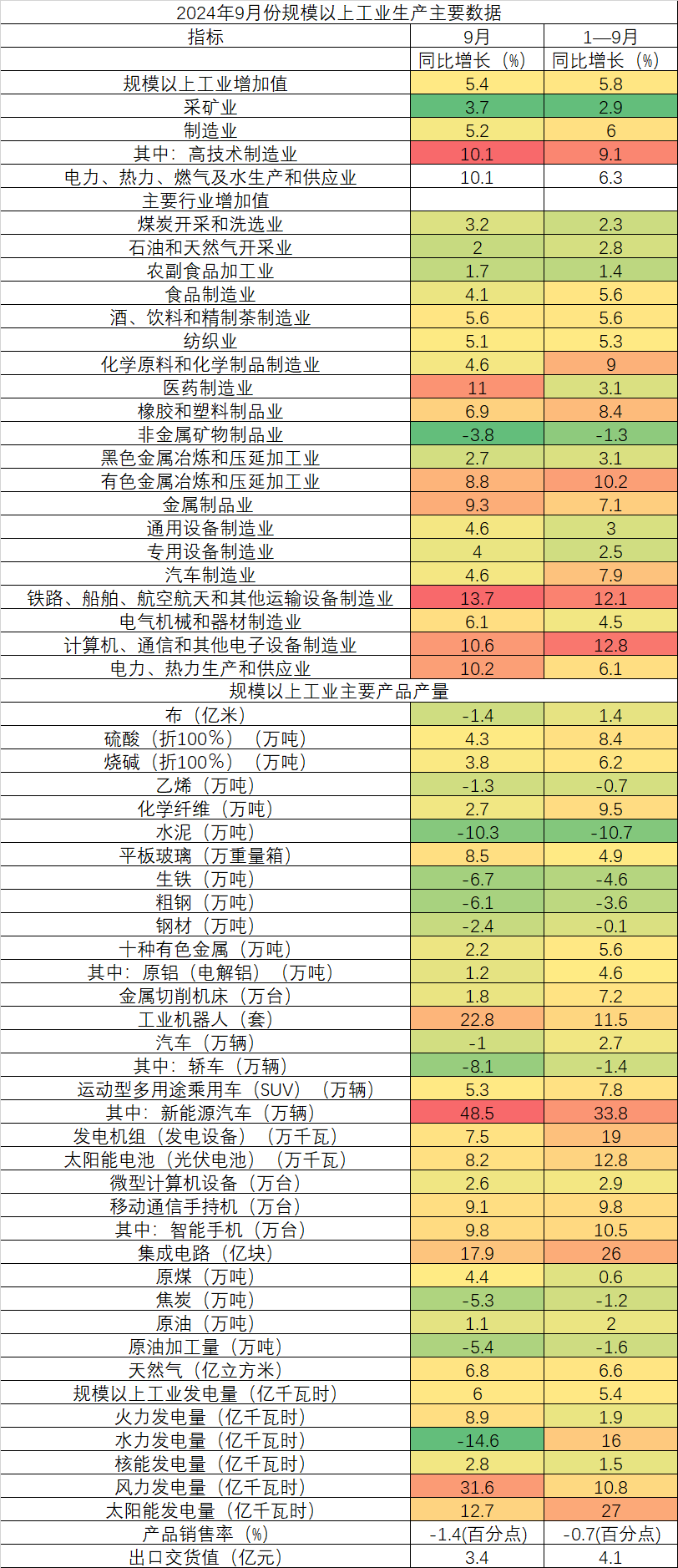 10月14日,国家统计局发布,三季度GDP同比增长4.6%,9月规模以上工业增加值同比增长5.4%。制造业增加值同比增长5.2%,比8月提高0.9个百分点,其中高技术制造业增加值同比增长10.1%,比8月提高1.5个百分点。