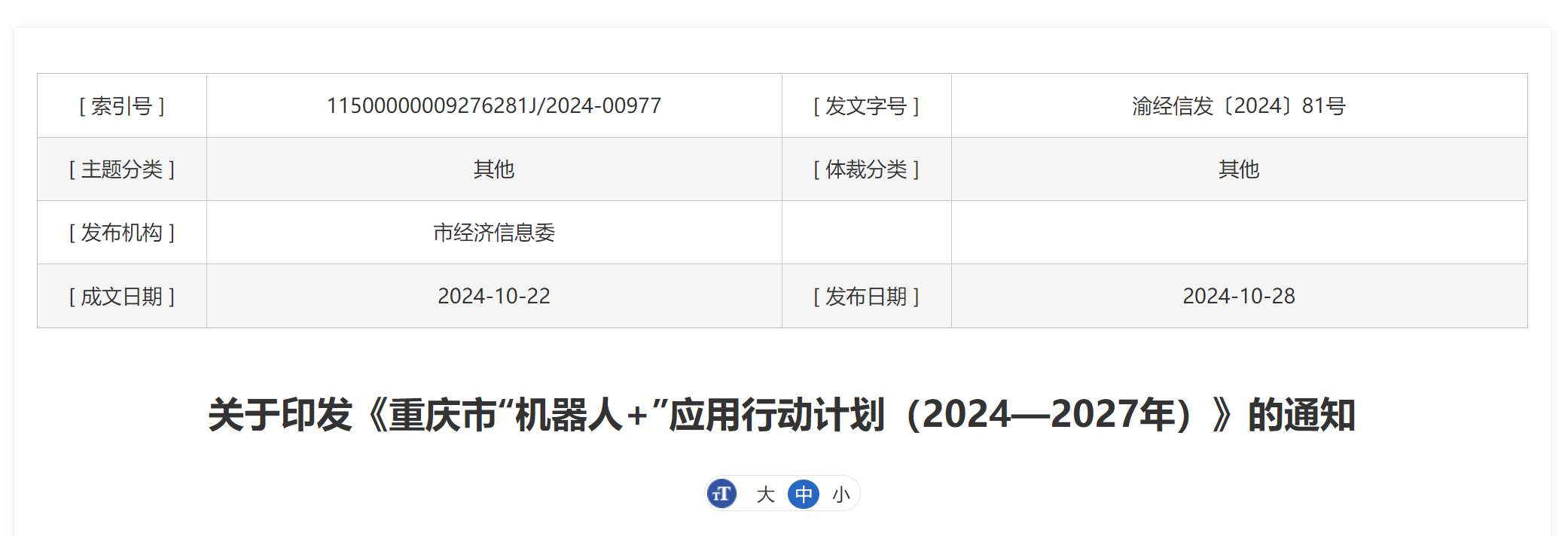 2024年10月28日,重庆市经信、科技、教育等8部门联合印发《重庆市“机器人+”应用行动计划(2024—2027年)》,提出到2027年,重庆市将创建一批“机器人+”应用场景,重点发展一批中高端机器人。