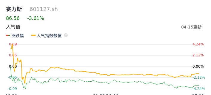 04月15日,赛力斯收报86.56,股价涨幅-3.61%,成交金额42.01亿元,换手率3.19%。