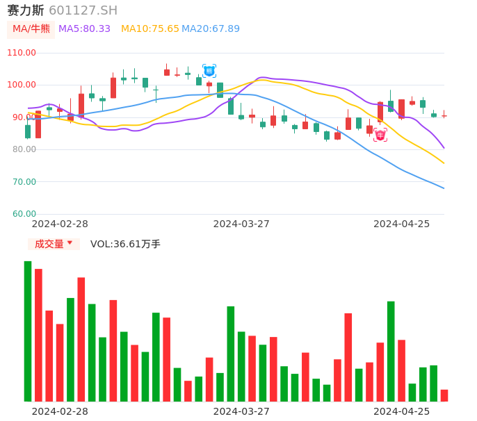 04月25日,赛力斯收报90.43,股价涨幅0.30%,成交金额33.22亿元,换手率2.42%。