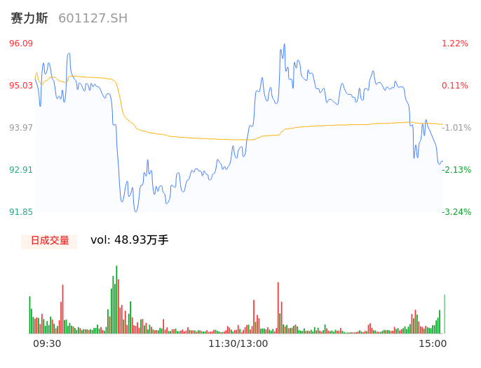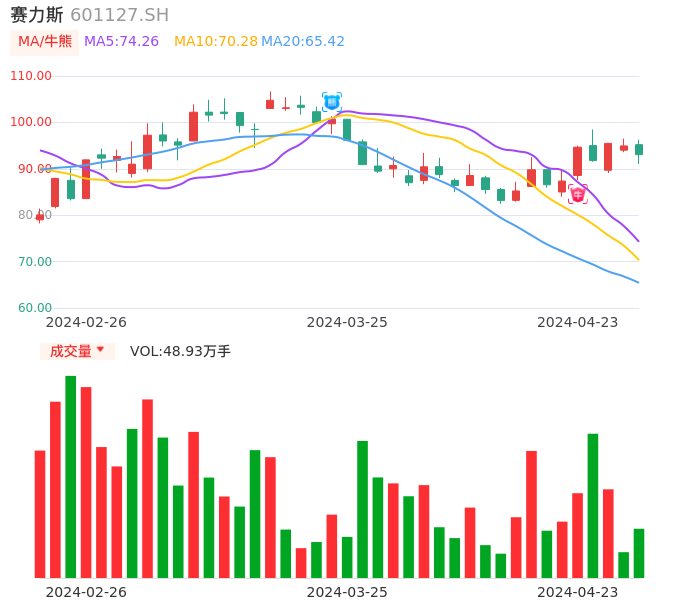 04月23日,赛力斯收报93.05,股价涨幅-1.98%,成交金额46.01亿元,换手率3.24%。
