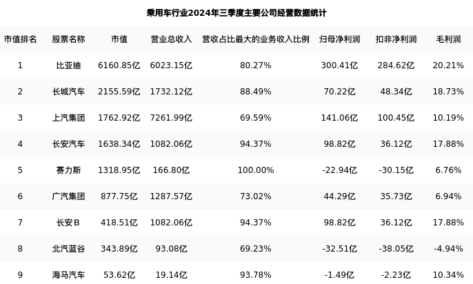 赛力斯最新报告期数据为三季度,下表汇总了乘用车行业内市值靠前的公司三季度主要经营数据