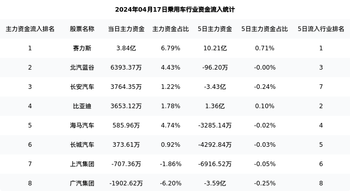 赛力斯今日净流入3.84亿元,主力占比6.79%,在行业内排名:1/8;5日净流入10.21亿元,主力占比0.71%,在行业内排名:1/8。