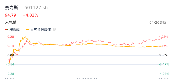 04月26日,赛力斯收报94.79,股价涨幅4.82%,成交金额59.20亿元,换手率4.22%。