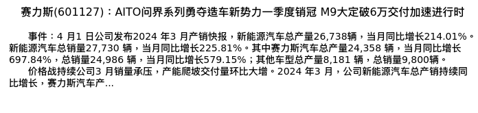 值得注意的是:2024年04月长城证券的梅芸分析师,首次发布关于赛力斯的研究报告,标题为:赛力斯(601127):AITO问界系列勇夺造车新势力一季度销冠 M9大定破6万交付加速进行时。