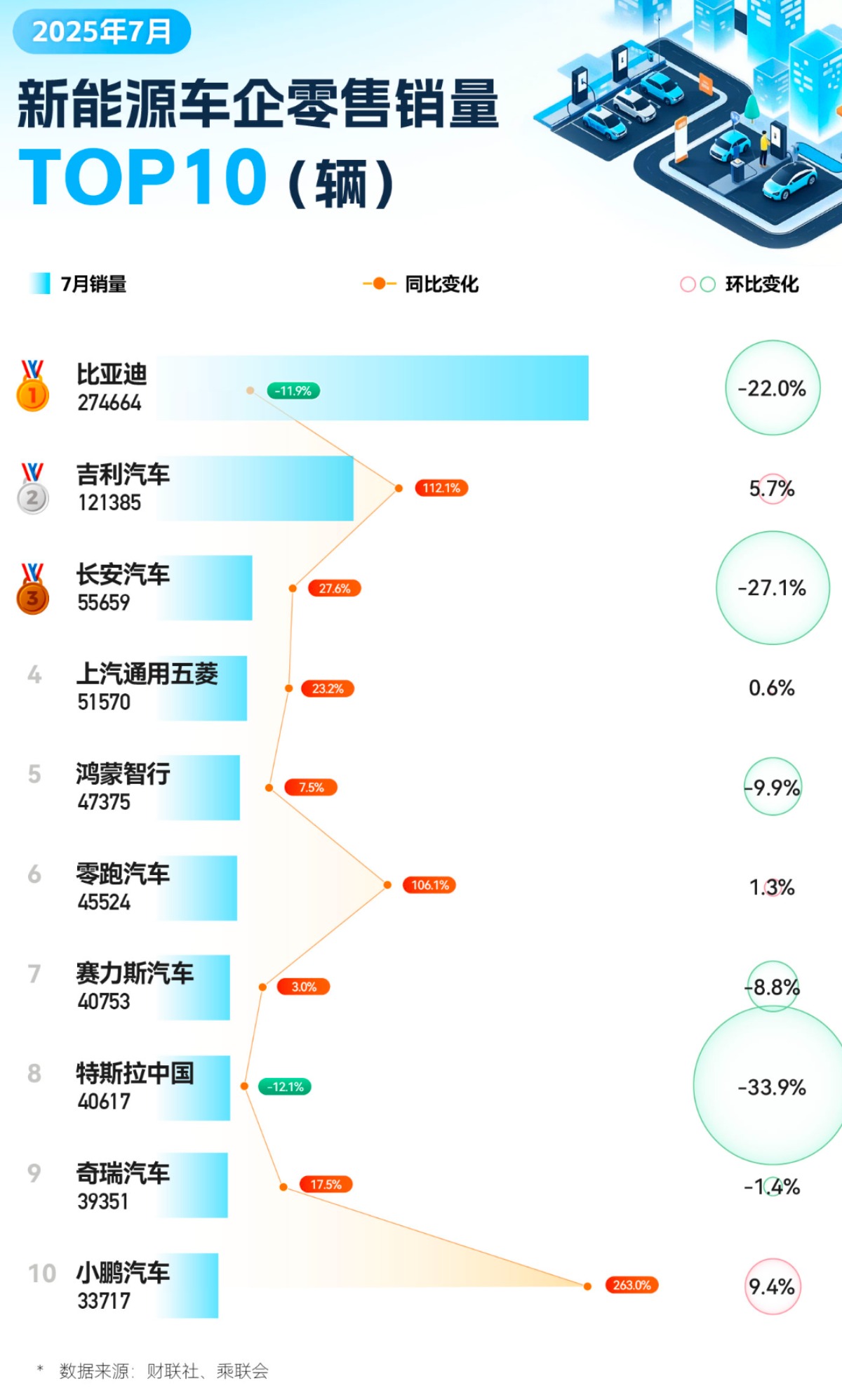 同时,伴随车市价格战因反内卷深入稍显平和,新能源汽车市场竞争格局持续重塑。7月新能源车企零售销量TOP10中,比亚迪蝉联榜首但同比、环比双降,吉利跃居第二且同比大增,小鹏成“黑马”同比飙升,特斯拉排名下滑且销量双降,本土车企展现强劲发展势能,市场分化明显。
