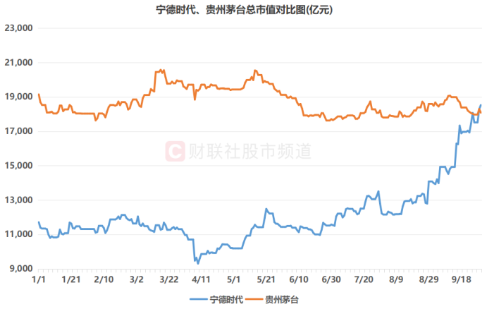 注1:宁德时代、贵州茅台总市值对比图(截至9月30日收盘)