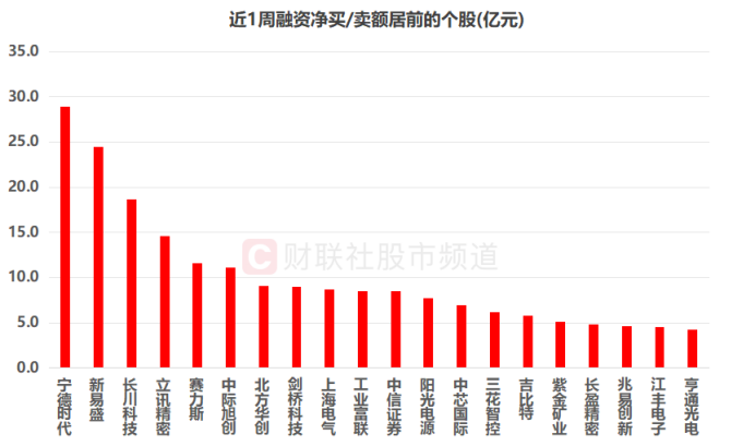 具体个股方面,同样以近1周行情统计,宁德时代、新易盛2股融资净买额唯二超20亿元,分别达28.88亿元、24.48亿元,长川科技、立讯精密、赛力斯、中际旭创融资净买额也均在10亿元以上。而寒武纪、胜宏科技融资净卖额唯二在10亿元以上,分别达14.51亿元、12.91亿元,北方稀土、东山精密、博瑞医药、比亚迪、协创数据等股融资净卖额也居前。