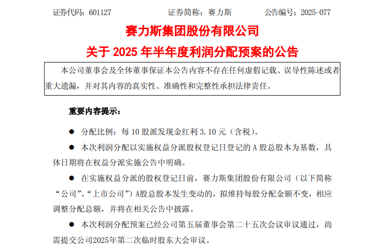 9月29日晚间,赛力斯披露2025年半年度利润分配预案,为进一步提高分红水平、增加分红频次、切实回报广大投资者,增强投资者获得感,公司结合经营发展实际、盈利能力、财务状况及可持续发展需要,拟以实施权益分派股权登记日登记的A股总股本为基数,向全体A股股东每10股派送现金3.1元(含税)。
