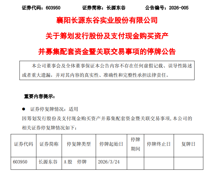 长源东谷表示,本次交易构成关联交易,预计构成重大资产重组,但不构成重组上市,不会导致公司控股股东及实控人变更。因前述交易尚处于筹划阶段,为避免造成股价异常波动,公司股票自2026年3月24日开市起停牌,预计停牌不超过10个交易日。