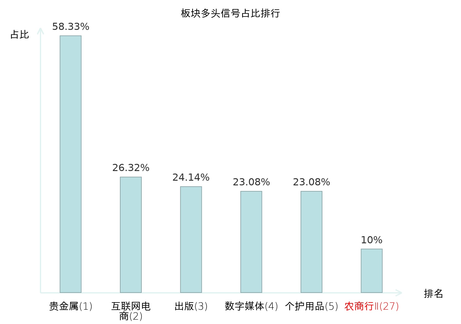 全市场所有行业板块中主力多头信号占比排名中,贵金属板块位居第一。贵金属板块名次提升最快,较昨日上升108位。