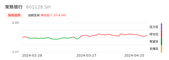 我们来看一下该股的九方特色指标强弱趋势的情况:常熟银行自03月25日从观望区上穿到持仓区。股价近期在多头区域持续强势上扬,上升动能仍较为充足,可积极关注。后续重点关注上方压力位:8.04元是否能突破上攻。