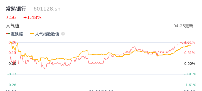 04月25日,常熟银行收报7.56,股价涨幅1.48%,成交金额1.45亿元,换手率0.73%。