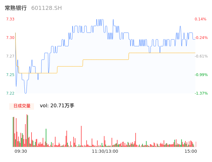 04月11日,常熟银行收报7.30,股价涨幅-0.27%,成交金额1.51亿元,换手率0.78%。