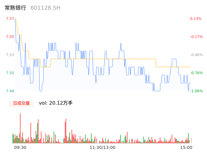 04月23日,常熟银行收报7.50,股价涨幅-0.79%,成交金额1.51亿元,换手率0.76%。