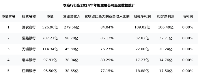 常熟银行最新报告期数据为年报,下表汇总了农商行行业内市值靠前的公司年报主要经营数据