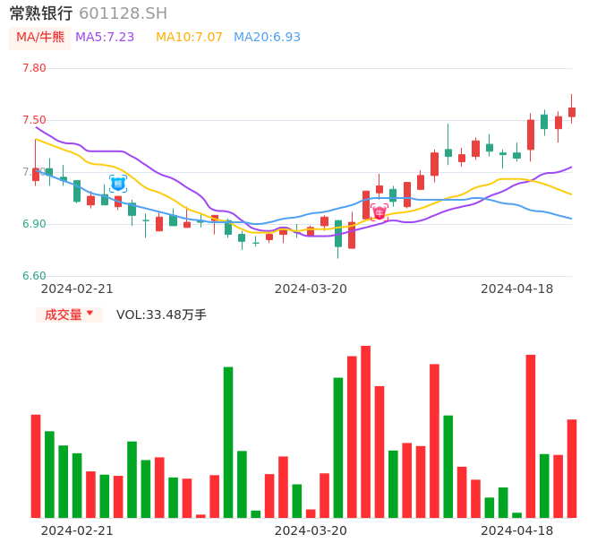 04月18日,常熟银行收报7.57,股价涨幅0.66%,成交金额2.53亿元,换手率1.27%。