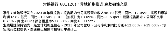 值得注意的是:2024年04月太平洋的夏芈卬分析师,首次发布关于常熟银行的研究报告,标题为:常熟银行(601128):异地扩张推进 息差韧性充足。