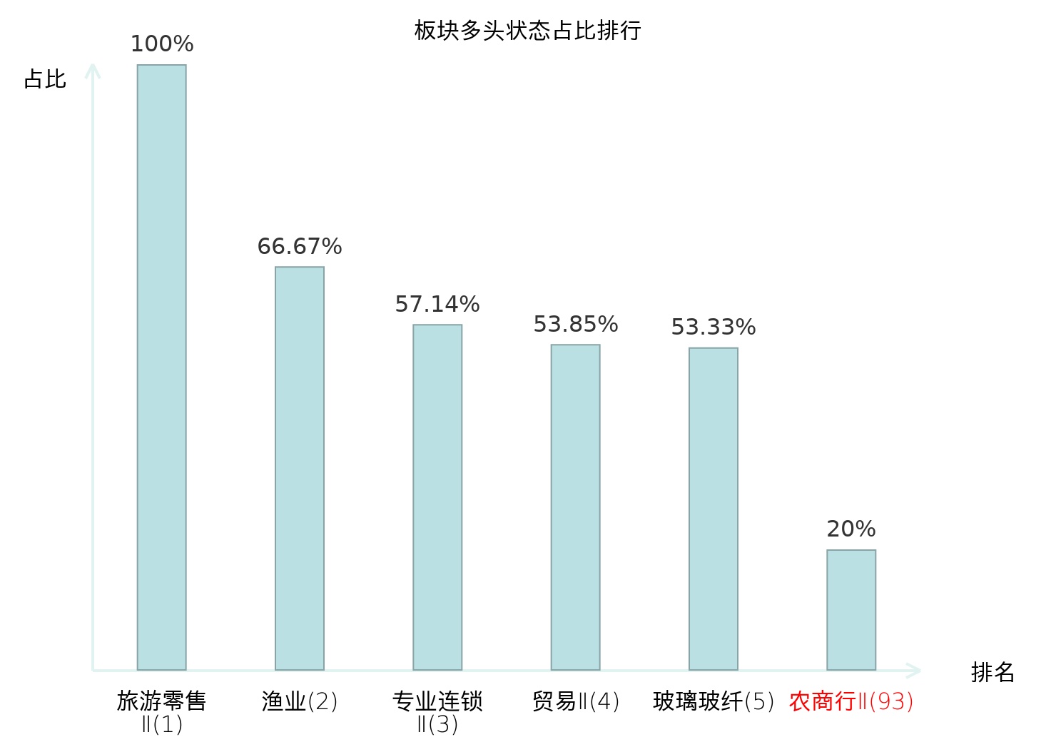 全市场所有行业板块中主力多头状态占比排名中,旅游零售Ⅱ板块位居第一。农业综合Ⅱ板块名次提升最快,较昨日上升83位。