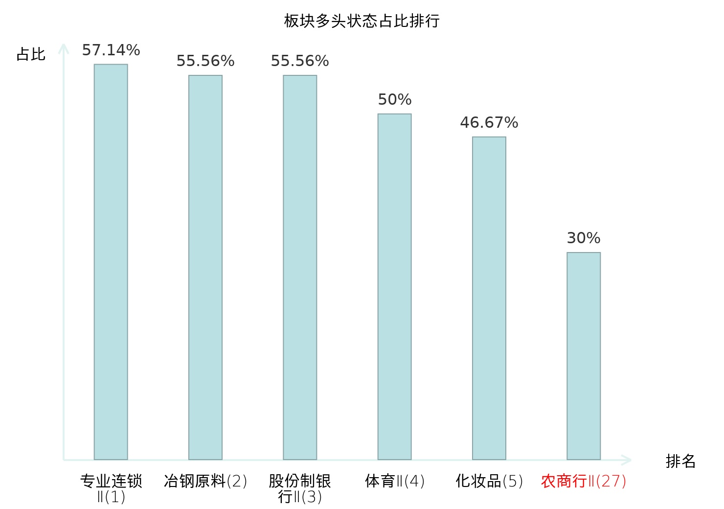 全市场所有行业板块中主力多头状态占比排名中,专业连锁Ⅱ板块位居第一。乘用车板块名次提升最快,较昨日上升85位。