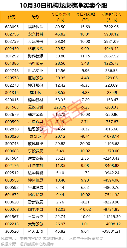 今日龙虎榜中,机构净买入的个股9只,净卖出的个股20只。福昕软件、永兴材料、天际股份、杭氧股份、海科新源、马可波罗净买入金额均超1200万元。