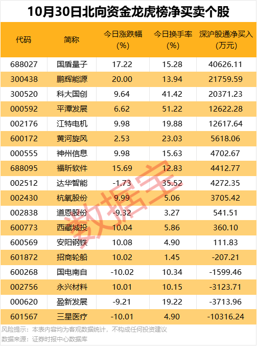 今日龙虎榜现身个股中,13股获北向资金净买入,国盾量子、鹏辉能源、科大国创、平潭发展、江特电机5股净买入金额居前,均超1.2亿元。