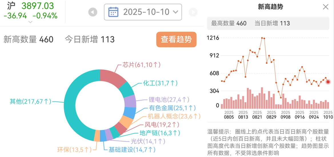 从百日新高去看,目前是在芯片>化工>锂电池(固态电池)>有色!芯片依旧占据第一!