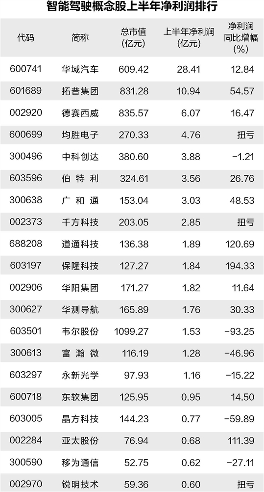 证券时报·数据宝梳理了A股38只智能驾驶概念股,其中28股今年上半年实现盈利,占比近74%。
