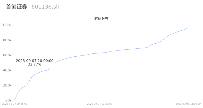 601136首创证券2023年09月07日成交113.17万手,成交金额28.61亿元,相较昨日放量33.62万手,换手率41.40%,成交活跃。
