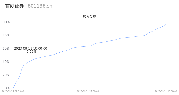 601136首创证券2023年09月11日成交76.52万手,成交金额18.34亿元,相较昨日放量1.50万手,换手率27.99%,成交活跃。