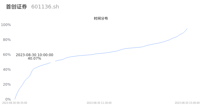 首先我们来看当日成交的时间分布。将今日交易时间按照5分钟的时间间隔进行切片,并绘制分布直方图进行观察。可以发现,10点之前的成交量占全天成交量的40.07%,这说明,该股票活跃时段换手火爆,资金热情高涨。