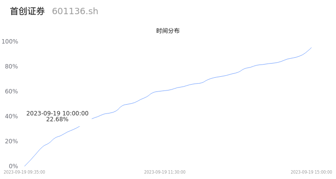 601136首创证券2023年09月19日成交34.25万手,成交金额7.48亿元,相较昨日放量3.36万手,换手率12.53%,成交活跃。